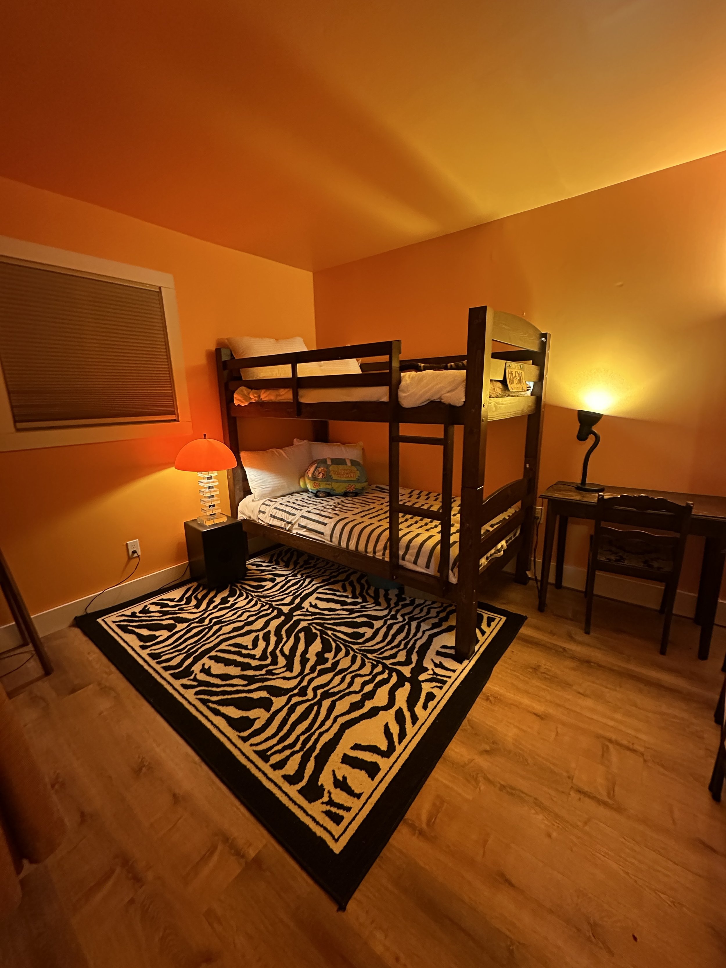 The front room has a bunk-bed and can accommodate 1-2 people. This room also features our laundry area which can be used by all guests.